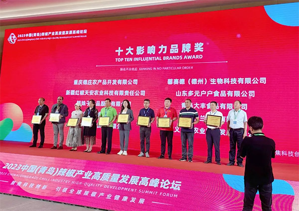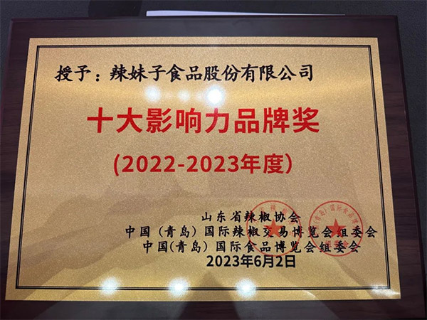 借著辣椒迅猛發(fā)展的勢頭,山東省辣椒協(xié)會、青島市辣椒產(chǎn)業(yè)商會、中國食品工業(yè)協(xié)會、山東省食品工業(yè)協(xié)會共同舉辦2023中國(青島)國際辣椒交易博覽會和2023第二十屆中國(青島)國際食品博覽會。本次會議以新食尚、新食機、擴內(nèi)需、促循環(huán)為主題,特邀請行業(yè)專家、產(chǎn)業(yè)代表、國內(nèi)外辣椒產(chǎn)業(yè)鏈龍頭企業(yè)代表齊聚一堂,設(shè)置包括前沿分享、主題沙龍、頒獎典禮等多個環(huán)節(jié),全方位、多視角共話辣椒產(chǎn)業(yè)相關(guān)政策。其中在頒獎環(huán)節(jié),辣妹子憑借出眾的品牌影響力和產(chǎn)品研發(fā)創(chuàng)新力,一舉斬獲“十大受歡迎影響力品牌獎”,收獲了來自行業(yè)的高度認可。